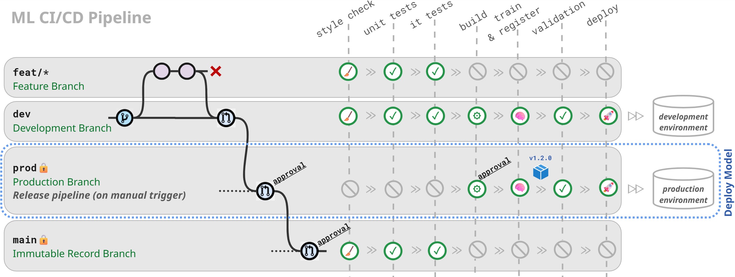 Adopted a GitOps flow (feat/* → dev → prod → main) to isolate environments and reusable across multiple models: